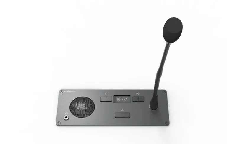 Врезной пульт делегата Televic Confidea F-DI — это компактное устройство для систем с базовыми функциями обсуждения. Оснащён громкоговорителем и разъёмом для съёмного микрофона (30, 40 или 50 см). Есть гнездо под штекер 3,5 мм для подключения наушников или индукционной петли. Для синхронного перевода предусмотрен селектор каналов с регулировкой громкости. На дисплее отображается ISO-код языка и громкость.