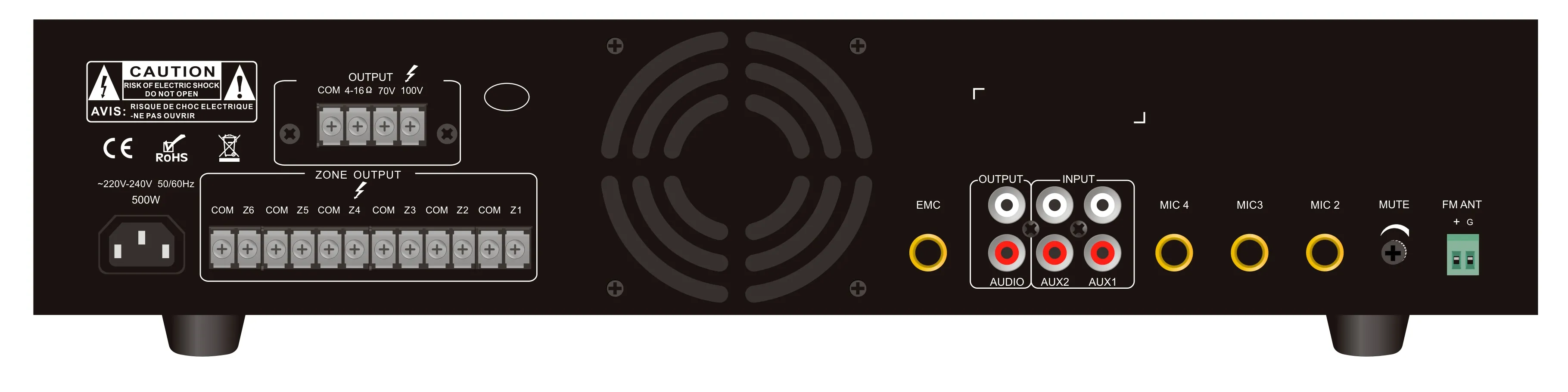 С помощью этого усилителя вы сможете транслировать звук на шесть отдельных зон и регулировать громкость для каждой из них индивидуально. Чтобы было удобнее организовать систему оповещения, продуман приоритет входных каналов: EMC> MIC1> MIC2 / MIC3 / MIC4 / AUX1 / AUX2 / MP3.
