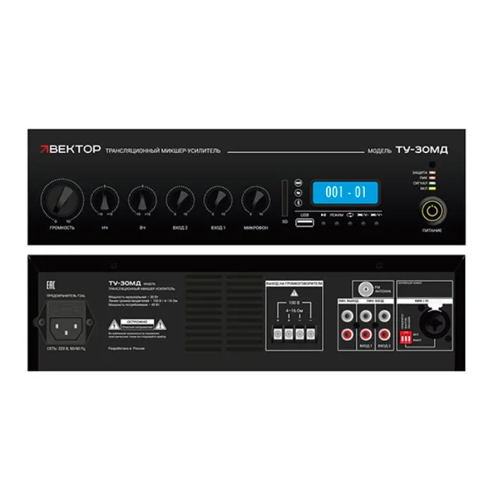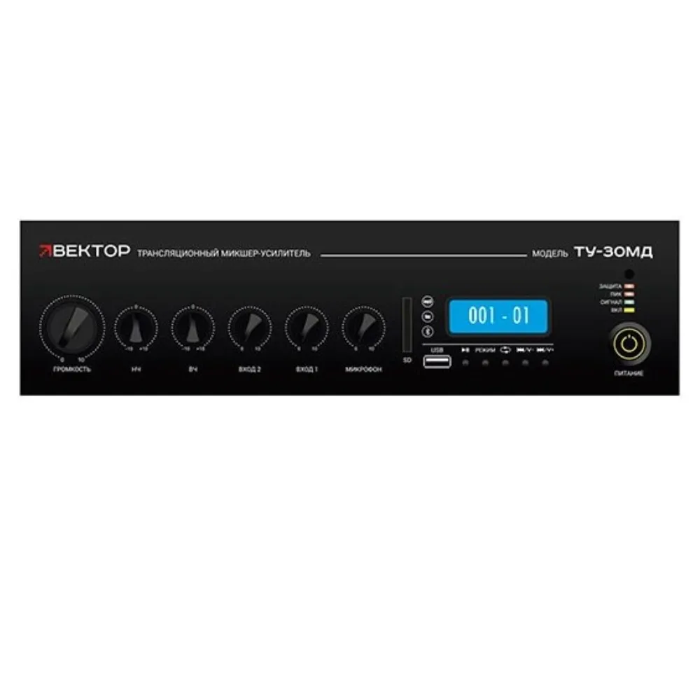 Микшер-усилитель ВЕКТОР ТУ-30МД - предназначен для звукоусиления и микширования аудио сигналов с дальнейшей трансляцией их через громкоговорители. В усилитель интегрирован модуль FM-тюнера и МР3-плеера, обеспечивающий поддержку форматов mp3 и WMA.ВЕКТОР ТУ-30МД снабжен разъемом для установки SD карты. Выбор и управление музыкальными источниками осуществляется в двух режимах с помощью функциональных кнопок на фронтальной панели усилителя и ИК-пульта.