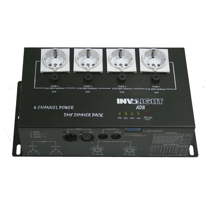 Описание Involight AD8Involight AD8 — цифровой диммер с 4 каналами, мощностью каждого 1 кВт. Управляется через DMX-512 и аналоговый сигнал 0-10 В. Имеет евровилку на входе и евророзетки на выходе. Защита обеспечивается автоматом на 16 А на входе и плавкими предохранителями на 6,3 А на выходе. Питание от сети 220 В, 50 Гц. Размеры устройства — 318x165x96 мм, вес — 2,95 кг. Продукция Involight отличается высоким качеством и доступной ценой.
