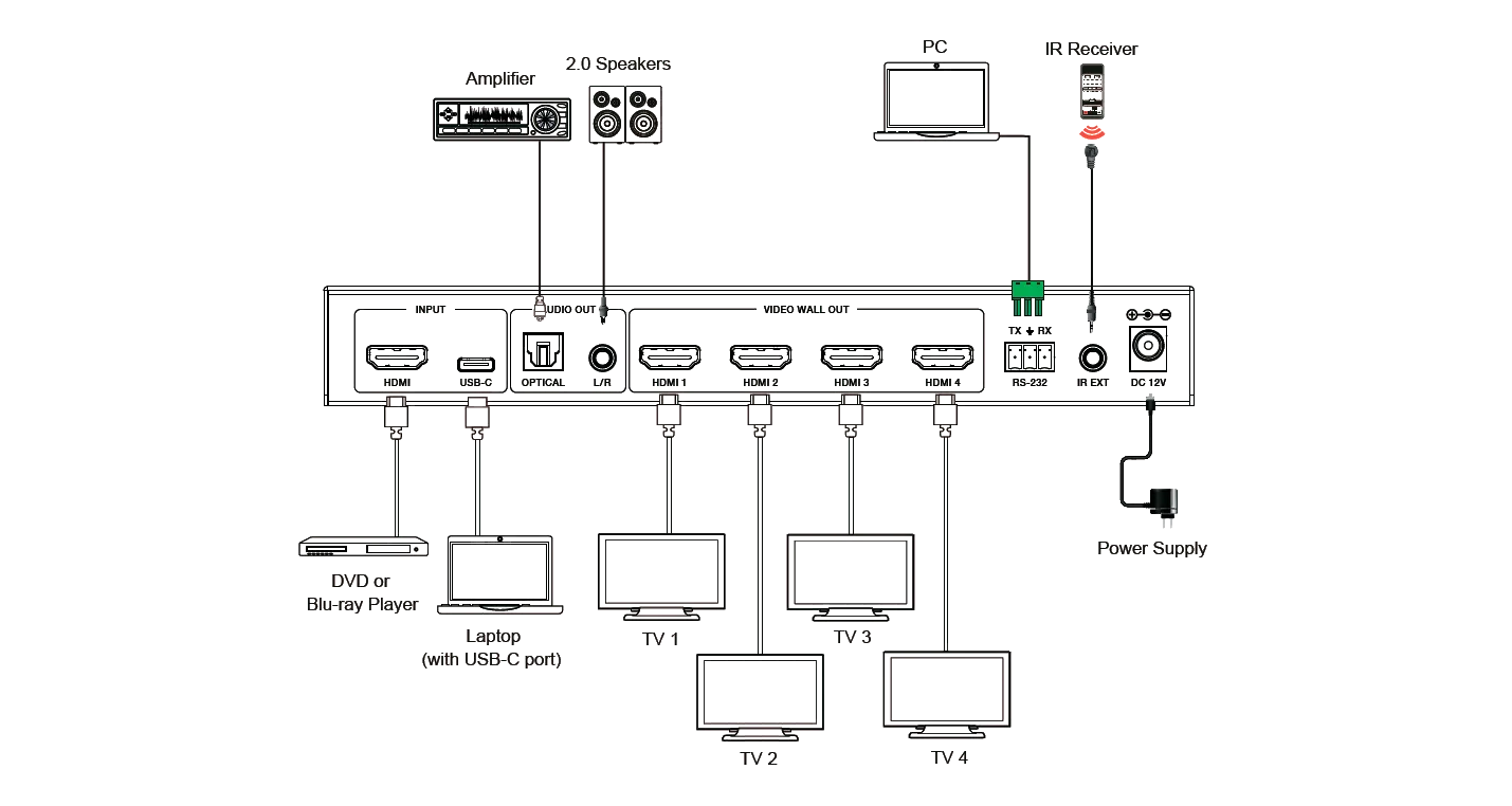 Описание контроллера видеостеныPrestel VWC-HC14 — контроллер видеостены с пропускной способностью до 18 Гбит/с. Имеет входы HDMI и USB-C с поддержкой разрешения до 4K@60 4:4:4, а также четыре выхода HDMI. Поддерживает восемь режимов сращивания видеостен и вывод звука (оптического и аналогового). Совместим с HDMI 2.0, HDCP 2.2 и DP1.2a. Управляется через переднюю панель, ИК-пульт и RS-232.