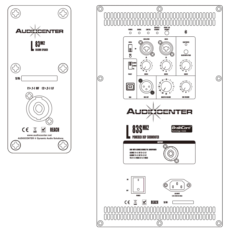 Активный сабвуфер Audiocenter L83S MK2 — компактная модель с DSP и двумя 12-дюймовыми динамиками. Оснащён ферритными магнитами и Bluetooth. Мощность — 2500 Вт RMS. Диапазон частот — 42–150 Гц, звуковое давление — до 131 дБ. Входные разъёмы: Combo (NEUTRIK® female XLR & Mono jack 6.35), Bluetooth. Габариты: 374х660х538 мм, вес — 32 кг.