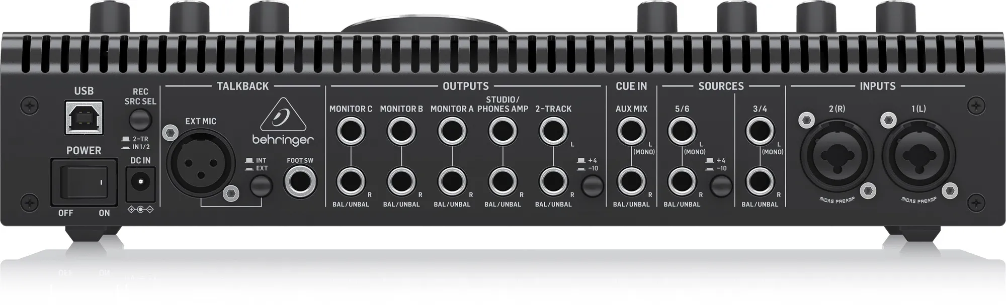Можно переключаться между тремя парами мониторов с индивидуальной регулировкой громкости, используя два входа XLR/TRS и дополнительный XLR вход. Есть стереовход Aux Mix, выход Studio / Phones Amp и вход для ножного переключателя. Встроенная USB-карта 2х4 поддерживает запись с микрофонов и вывод сигнала с компьютера.