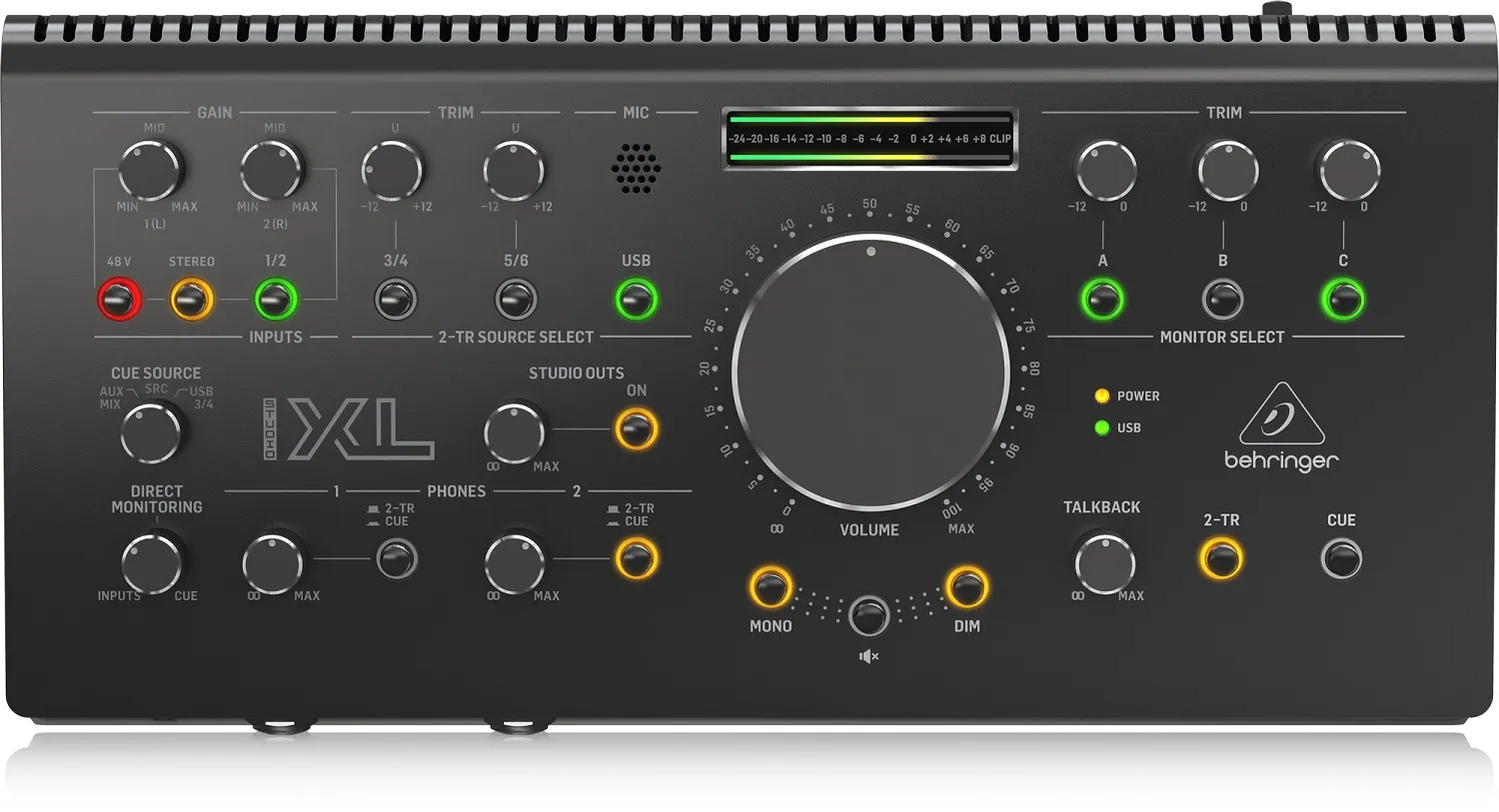 Студийный мониторный контроллер Behringer STUDIO XL — это продвинутая версия модели Studio L. Устройство оснащено микрофонными входами Midas, кнопками управления, функцией Talkback и встроенным микрофоном. Есть потенциометр с VCA, выходы на наушники, стереовход и 2-Track выход.