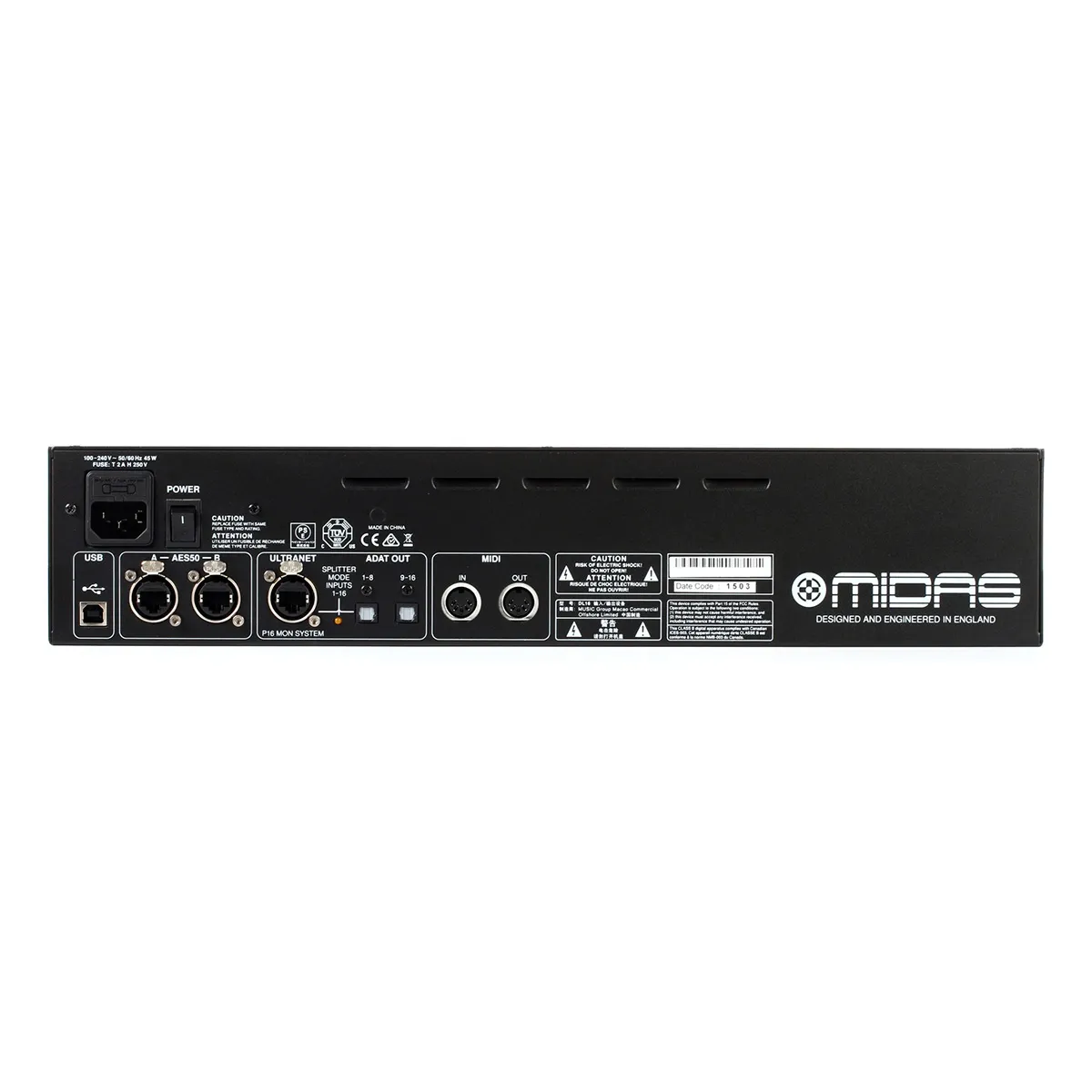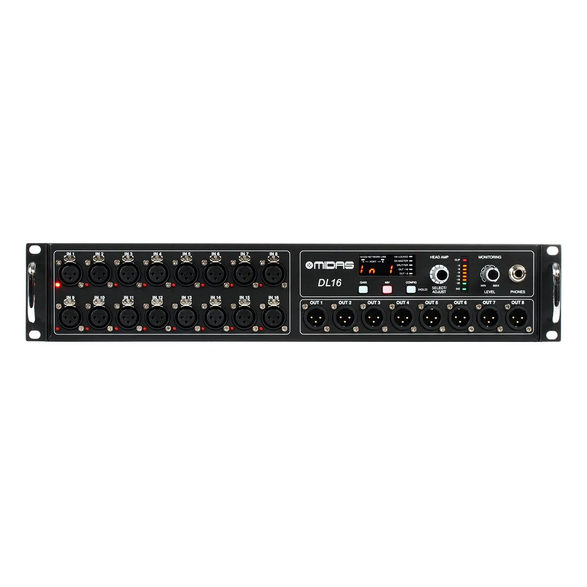 Стейдж-бокс MIDAS DL16 — коммутационный блок для микшерных консолей. Включает 16 микрофонных предусилителей, порт Ultranet, фантомное питание +48В и другие функции. Подходит для концертов, студийной работы. Имеет рэковый размер 2U, чёрный металлический корпус. Особенности: пост-DAC фильтрация, порты AES50, возможность индивидуального назначения наушников для мониторинга качества звука.
