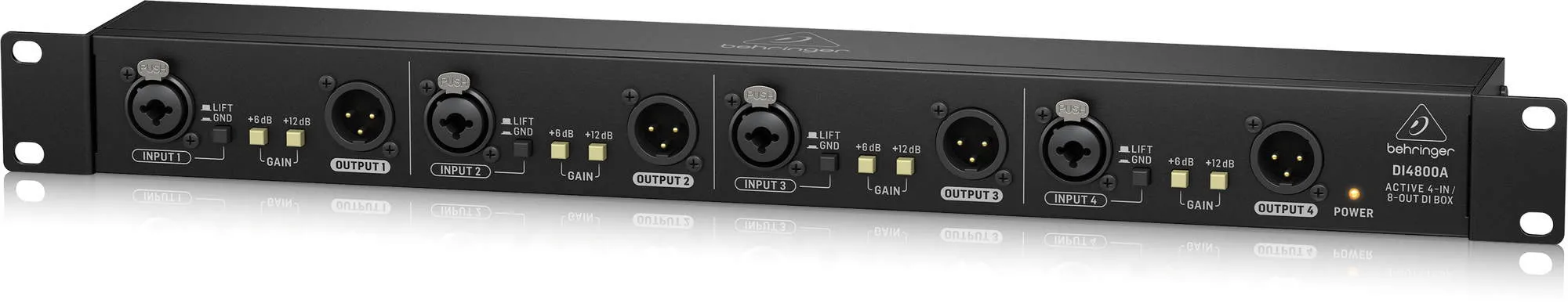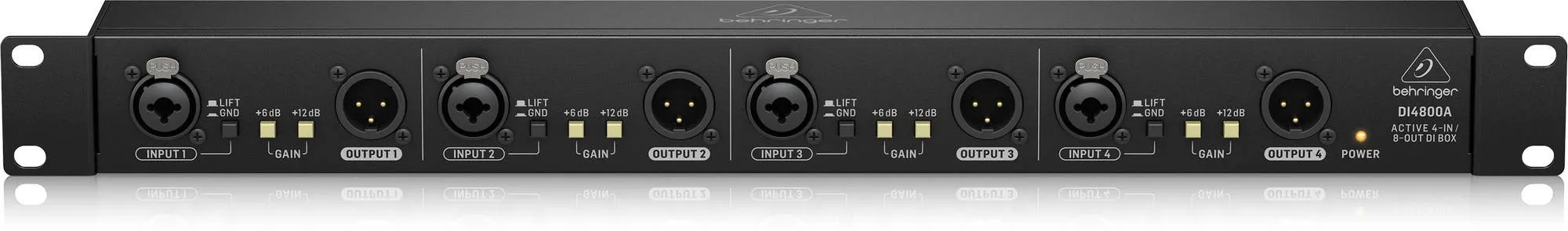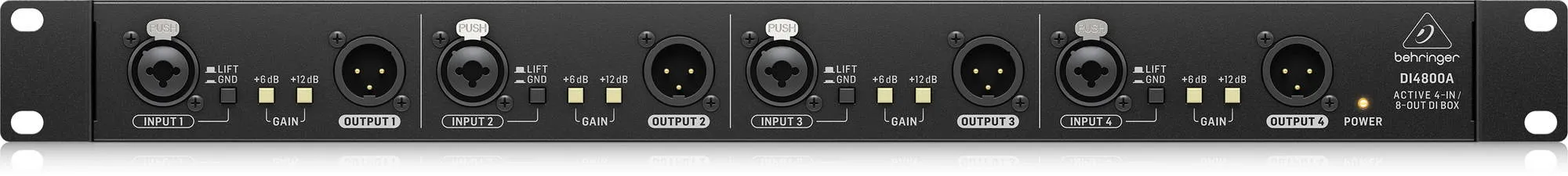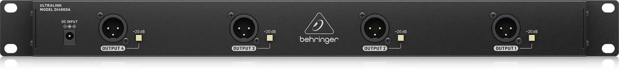 Описание ди-бокса Behringer DI4800AАктивный ди-бокс Behringer DI4800A — это устройство рэкового формата, объединяющее четырёхканальный ди-бокс, бустер сигнала и линейный изолятор. DI4800A оснащён двумя входами (XLR и TRS), двумя переключателями гейна и обеспечивает усиление до +18 дБ. Есть функции заземления и выравнивания сигнала, а также порты 6,3 мм «Link» и «Thru». Для вывода сигнала предусмотрены два изолированных XLR-разъёма.