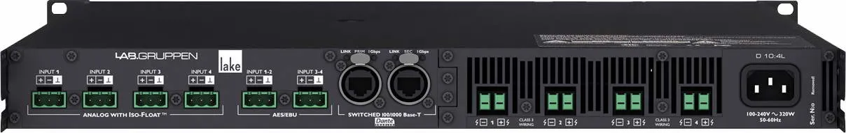 Данная инсталляционная серия уже получила высокие оценки на рынке и до последнего момента была представлена 4-канальными моделями с суммарной максимальной мощностью 8, 12 и 20 кВт. Разумеется, столь высокие мощности требуются от усилителя далеко не всегда. Идя навстречу пожеланиям рынка, серия была расширена за счет трех новых моделей меньшей мощности: D 40:4L – 4000 Вт, D 20:4L – 2000 Вт и a D 10:4L – 1000 Вт.Кроме обычного низкоомного режима, новые модели поддерживают работу и с трансляционными линиями 70 и 100 В. Одной из главных особенностей усилителей Lab Gruppen, обеспечивающей им необычайную гибкость в применении, является система управлением мощностью. Она позволяет перераспределять мощность между каналами усилителя в пределах общей мощности блока питания. Так, например, для усилителя D 20:4L с общей мощностью 2000 Вт максимальная равная мощность для всех четырех каналов на нагрузке 4 Ом составляет 500 Вт, но максимально возможная мощность каждого из каналов 1600 Вт. Таким образом, усилитель может быть запрограммирован для самых разных задач, начиная от многозонных систем звукоусиления и заканчивая многополосным усилением любых конфигураций. Работу со сложным разделением полос и эквализацией обеспечивают 4 встроенных процессорных модуля Lake Contour.