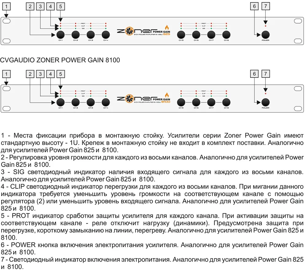 CVGaudio ZONER Power Gain-825 — профессиональный усилитель мощности класса D. Поддерживает 8 выходных каналов на акустику. Мощность на канал: 25 Вт при 8 Ом, 50 Вт при 4 Ом, 90 Вт при 2 Ом (в мостовом режиме). Диапазон частот: 20 Гц–20 кГц. Соотношение сигнал/шум: 100 дБ.